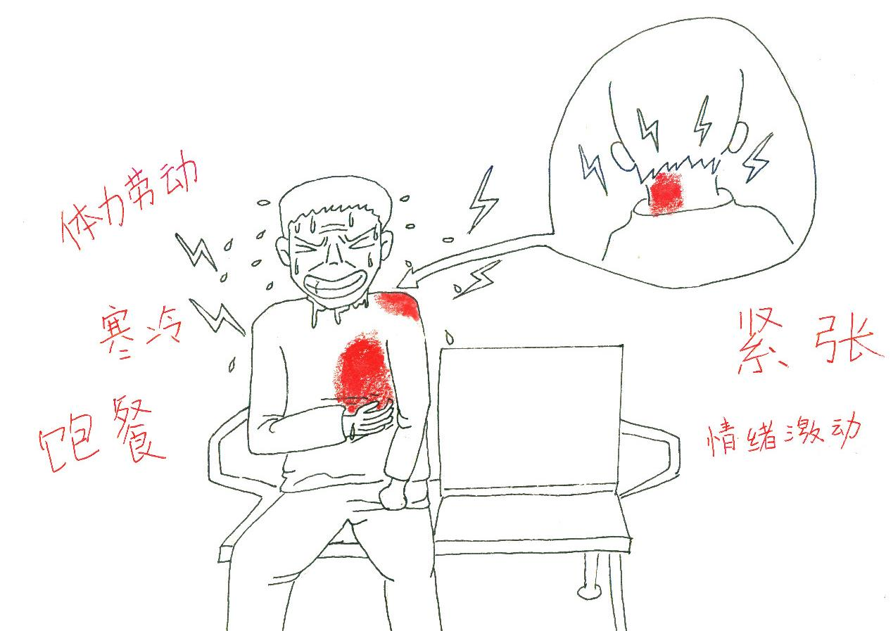心梗常在受凉、饱餐、劳力活动或情绪激动时发作,胸痛、胸闷或胸前压迫感、紧迫感,最常见在胸前正中或稍偏左,有的是整个胸前,也有的在上腹部(心窝处),半数以上患者胸痛有牵扯到其它部位,如左肩、左手是最常见的部位。持续时间多在1-15分钟左右,较少超过30分钟,在休息或舌下含服硝酸甘油后,一般在2-5分钟内能明显缓解。也可以突然发作,可以无任何先兆不适。