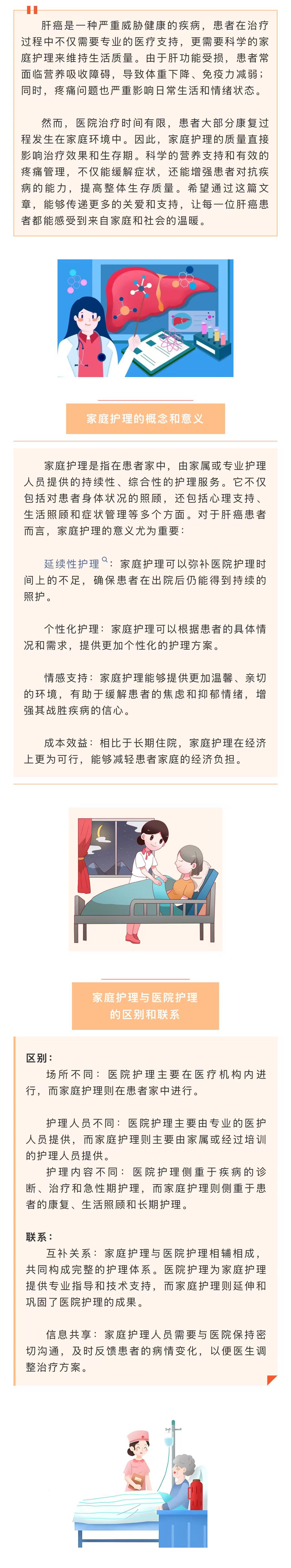图文简介: 肝癌是一种严重威胁健康的疾病,患者在治疗过程中不仅需要专业的医疗支持,更需要科学的家庭护理来维持生活质量。科学的营养支持和有效的疼痛管理,不仅能缓解症状,还能增强患者对抗疾病的能力,提高整体生存质量。