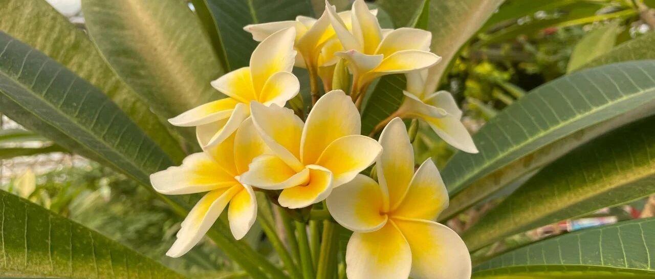 科普延伸:鸡蛋花是夹竹桃科鸡蛋花属的落叶小乔木。它在佛教文化中也有一定象征意义,是佛教的五树六花之一,它的叶片大而厚实,呈长椭圆形,聚生于枝顶。是热带地区常见观赏植物,树形美观,花朵芬芳。花朵由五片花瓣组成,外面乳白色,中心鲜黄色,就像切开煮熟的鸡蛋一样,造型别致,香气扑鼻。
