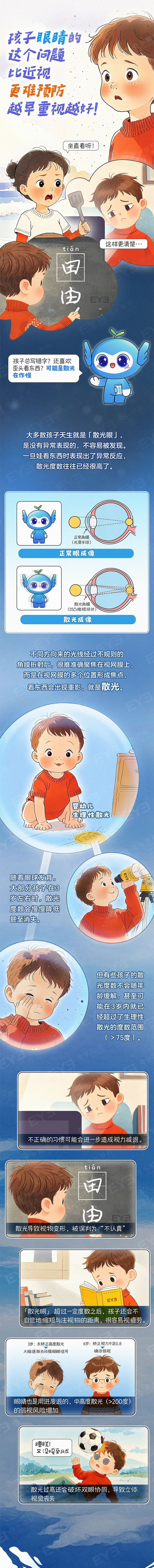 图文简介: 散光虽无法预防,但可控! 3岁建立屈光档案,6岁前抓住矫正黄金期 科学矫正,尽量避免弱视、 视功能损伤等终身隐患。 早筛查、早干预,别让散光 成为孩子成长的绊脚石!