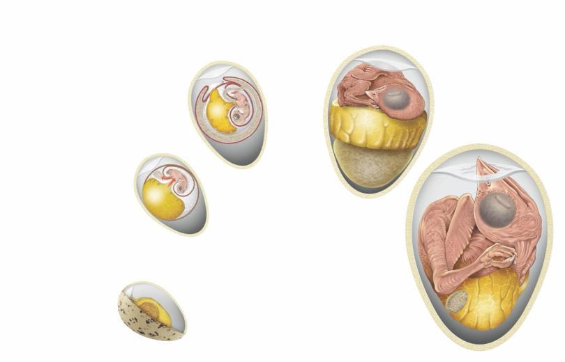当卵子受精后,胚胎会从卵黄的一侧开始发育。为了防止卵黄在移动过程中移位,它会被由浓卵白组成的卵黄系带固定在卵白中央。随着胚胎的发育,血管网开始形成,并出现心跳。大约五天后,胚胎继续生长,雏鸡的眼原基也开始分化。卵黄通过卵黄囊血管为胚胎提供所需的营养。