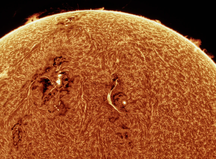 在鲍勃拍摄的这张图像中,我们还能看到太阳表面出现了许多“针状体”,就像橙色的皮毛在太阳盘面蔓延着,它们是跨度达到数千公里的热气体喷流,不断扰动着色球层。由此可见,增加了氢-α滤光片后拍摄的太阳照片,能将色球层上的许多细节都展现在眼前,为太阳观测增添了更多趣味。