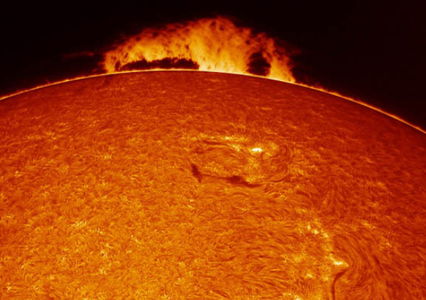 上图是一名叫鲍勃·安托尔的天文爱好者使用加装氢-α滤光片后的望远镜拍摄的太阳巨型日珥的图像。日珥是恒星表面的能量活动,跨度之广甚至可以容纳下多个地球,由于其形状呈现出环形,因此被称为日珥。