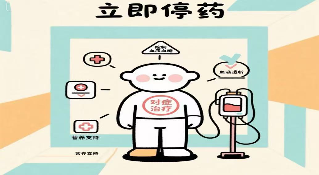 立即停药:联系医生调整治疗方案。对症治疗:补液、碱化尿液(如碳酸氢钠)加速药物排出。严重者需血液透析临时替代肾功能。营养支持:低盐、优质蛋白饮食(如鸡蛋、鱼肉),控制血压血糖。
