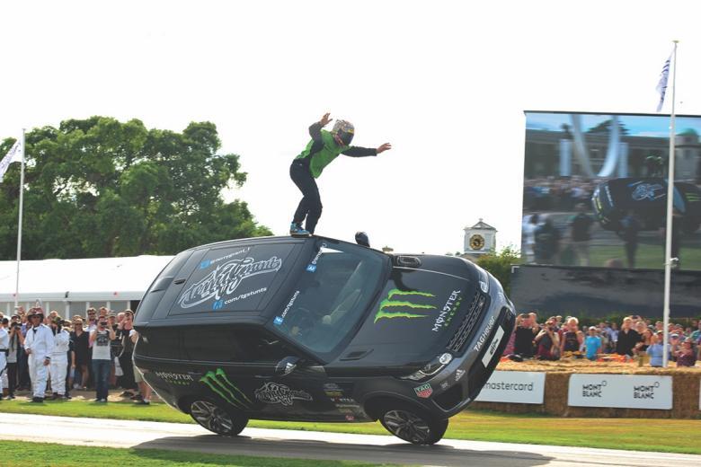 这位特技演员正在表演一项危险特技──站在一辆单边倾斜、以两轮行驶的汽车上面。
