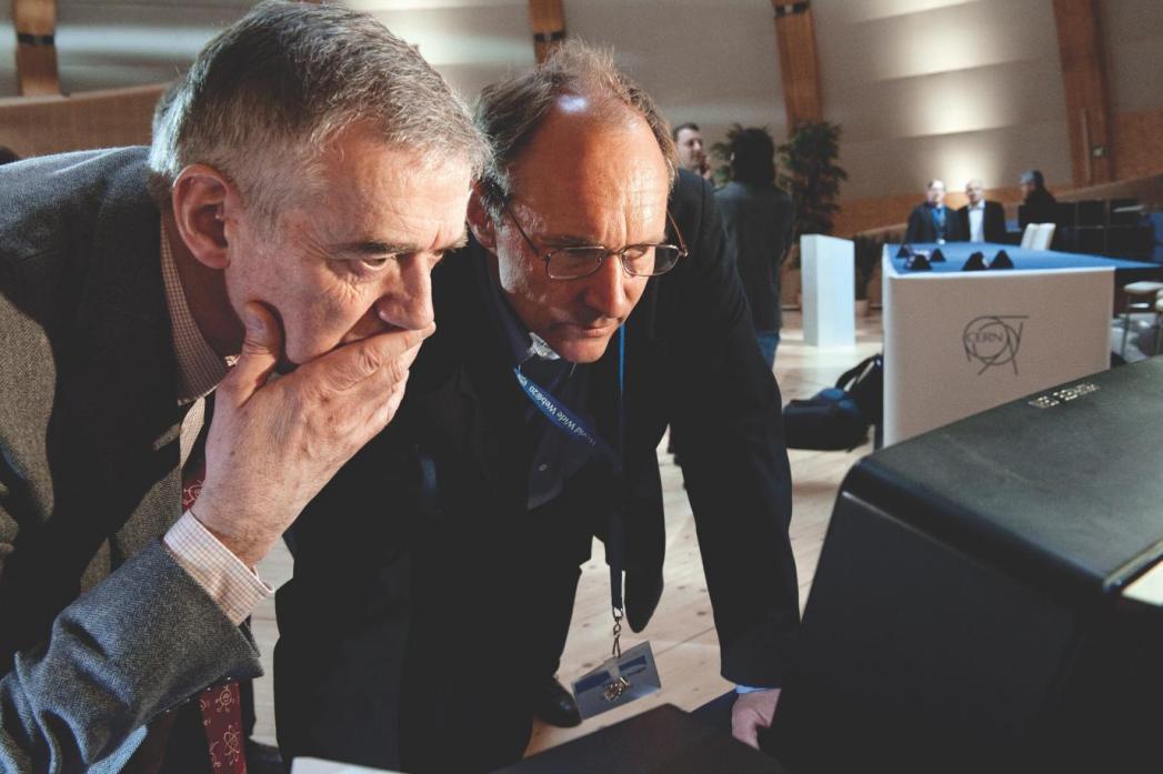 科学家罗伯特·卡里奥(左)与提姆·柏内兹—李爵士(右)共同利用NeXT计算机进行万维网计划。
