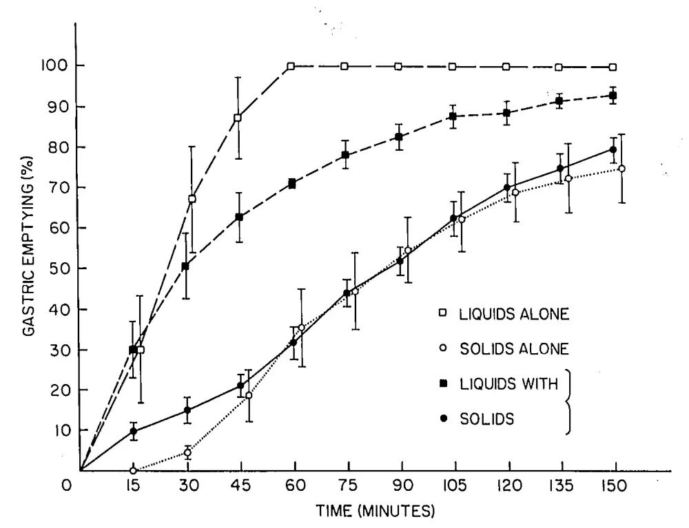 影像学研究发现,液体和固体在胃里的排空速度本就不同。液体通常以指数曲线方式迅速离开胃部,而固体则需要先被研磨到直径小于 1 毫米,才能一点点通过幽门进入小肠,因此排空速度更慢。当两者混合进餐时,液体的排空会受到固体的轻微延迟影响,但固体的排空几乎不受液体影响。[1]换句话说,一口饭配一口水,并不会让食物泡在胃里动弹不得。