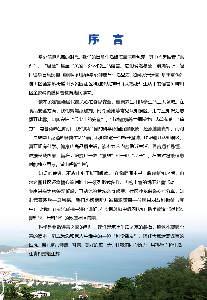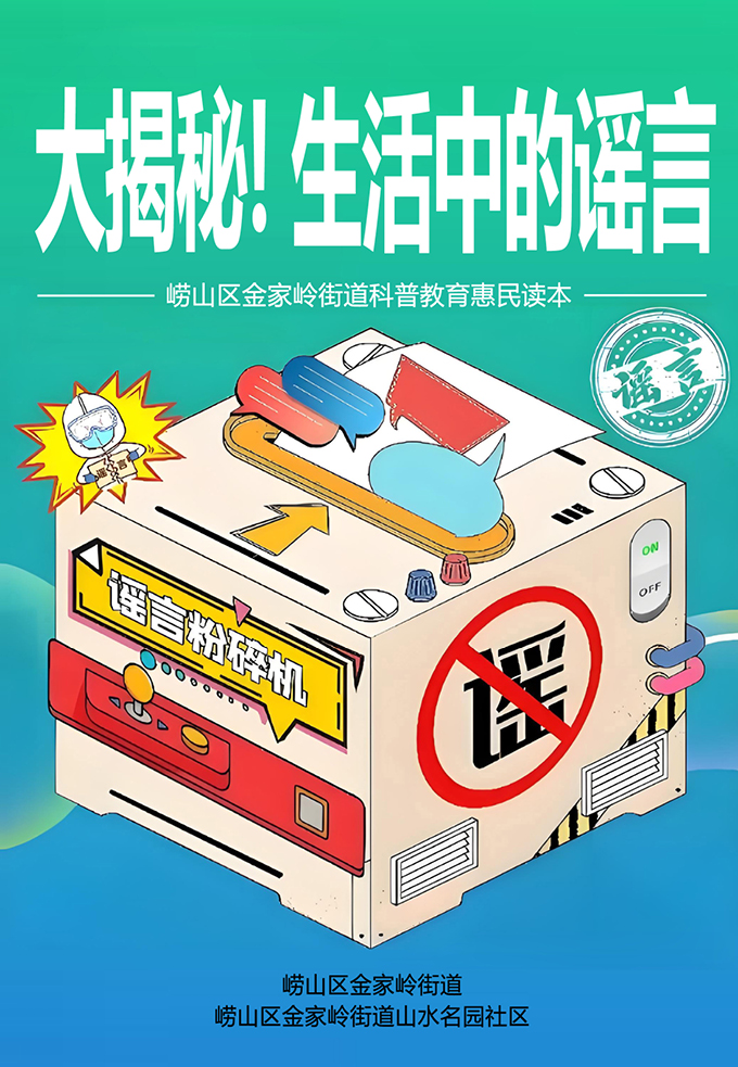 身处信息洪流的时代,我们的日常生活被海量信息包裹,其中不乏披着“常识”、“经验”甚至“关爱”外衣的生活谣言。它们悄然蔓延,混淆视听,轻则误导日常选择,重则可能影响身心健康与生活品质。如何拨开迷雾,明辨真伪?崂山区金家岭街道山水名园社区特别策划推出《大揭秘!生活中的谣言——崂山区金家岭街道科普惠民读本》。