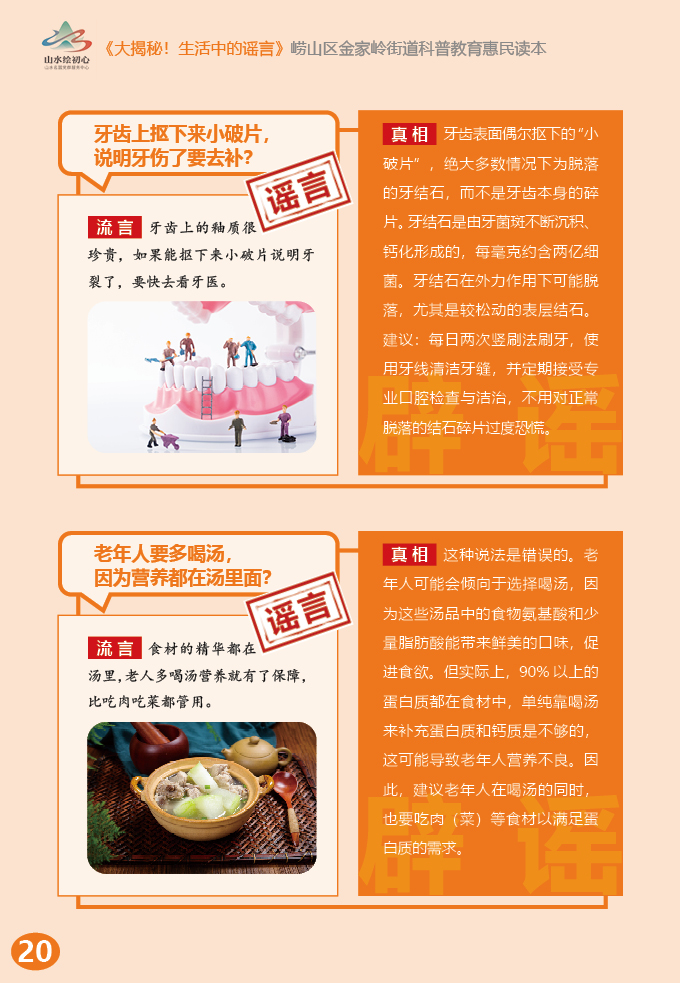 图文简介: 身处信息洪流的时代,我们的日常生活被海量信息包裹,其中不乏披着“常识”、“经验”甚至“关爱”外衣的生活谣言。崂山区金家岭街道山水名园社区特别策划推出《大揭秘!生活中的谣言》