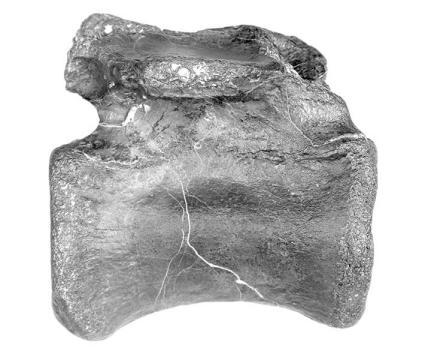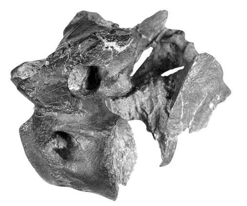 这是首块出土的骨头。这块脊椎骨在被詹姆斯·洛克耶发现时,就早已经断裂。但与其它形似的兽脚亚目骨头比对后,专家认为这块骨头应位于恐龙颈部偏上的位置。