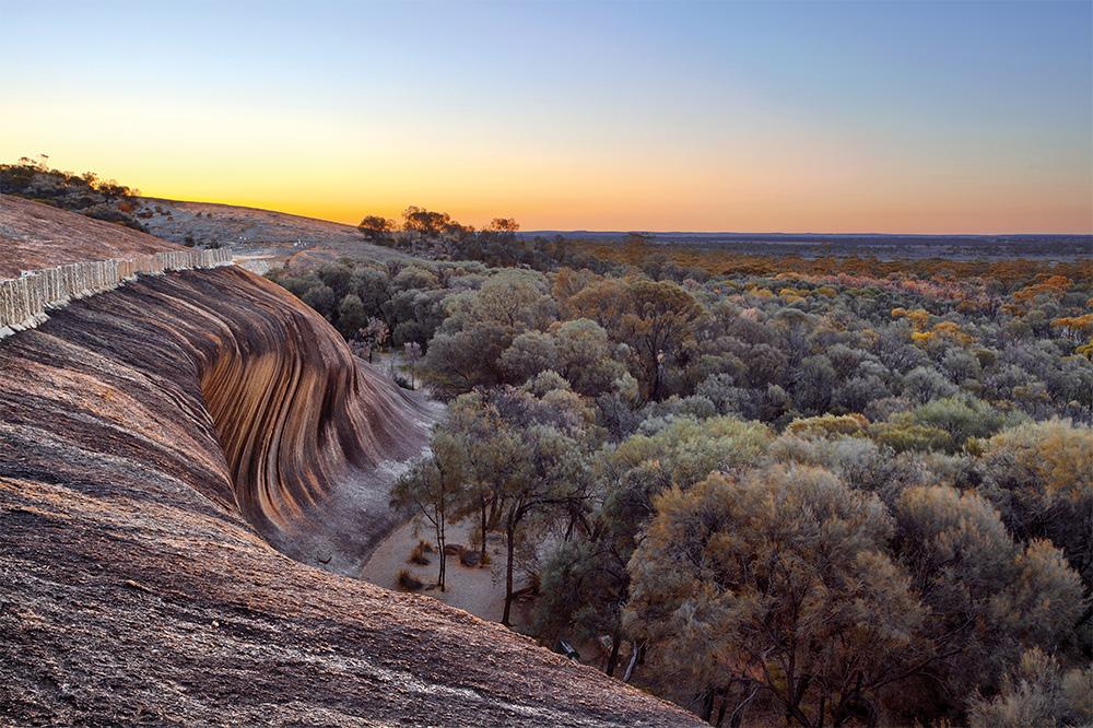 澳大利亚西部的波浪岩是一处令人叹为观止的花岗岩地貌。这块长达110米、高15米的巨型岩体形成于25亿年前的前寒武纪时期,是地球上最古老的岩石构造之一。其独特的波浪造型源于差异风化作用:底部较松软的岩层在风雨侵蚀下逐渐退缩,而顶部较坚硬的花岗岩则形成突出的“浪头”。岩石表面鲜艳的色带是由多种矿物氧化形成的,其中铁质矿物产生红色调,锰矿物呈现黑色,而亲水藻类的季节性生长又增添了额外的色彩变化。这种自然形成的矿物色谱记录了该地区漫长的气候变迁史。
