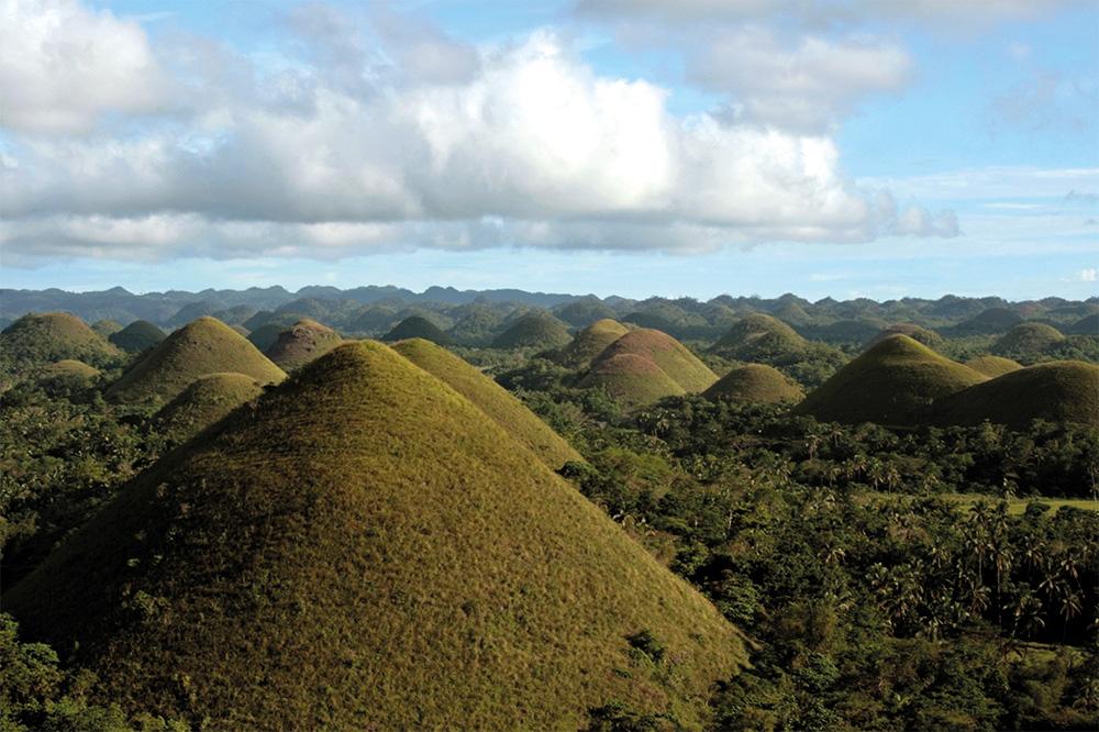 菲律宾保和岛的巧克力山丘是全球最典型的喀斯特地貌之一。这片由1260至1776座圆锥形山丘组成的奇观,其形成机制与常规山脉截然不同。这些高度在30米~120米之间的山丘实际上是古石灰岩台地在溶蚀作用下的残余体。富含二氧化碳的地下水持续溶解石灰岩基岩,形成地下洞穴系统,最终导致地表塌陷,仅留下这些被草被覆盖的孤立山丘。值得注意的是,这些山丘异常规则的几何形态反映了石灰岩均匀的溶蚀速率,而其表面覆盖的草被在旱季会变成巧克力色,赋予这片景观独特的外观。