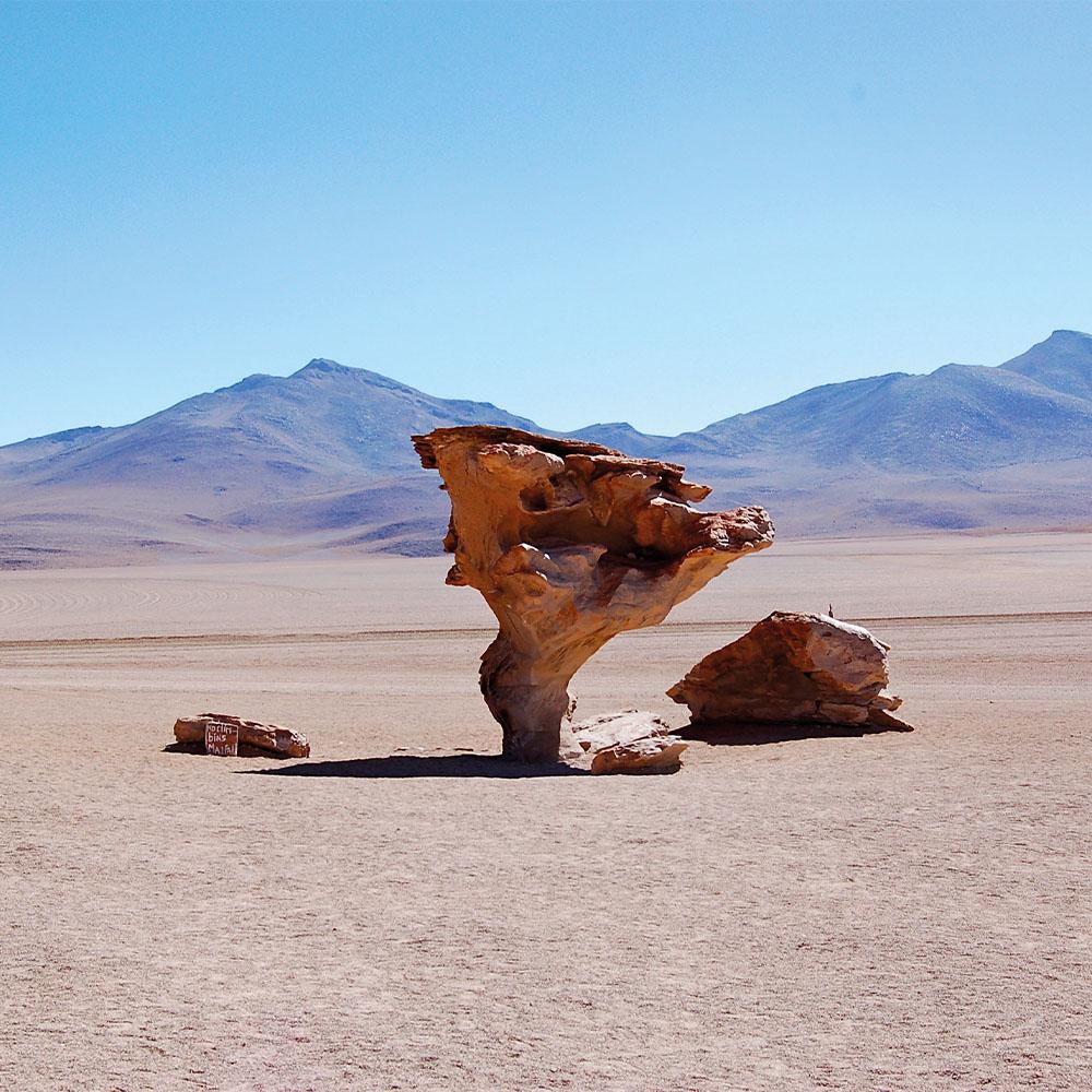 玻利维亚的石树是风蚀作用的杰出代表。这个位于西洛利沙漠的5米高独立岩柱,其形成过程始于数百万年前的火山活动。岩体由抗风化能力差异显著的两类矿物组成:较松软的石英质部分被沙漠强风迅速侵蚀,形成纤细的“树干”;而富含铁质的坚硬部分则抵抗侵蚀,构成稳固的基部。持续的风沙磨蚀作用最终雕刻出了这个违背重力直觉的树状结构,见证了自然力量对岩石的精细塑造能力。
