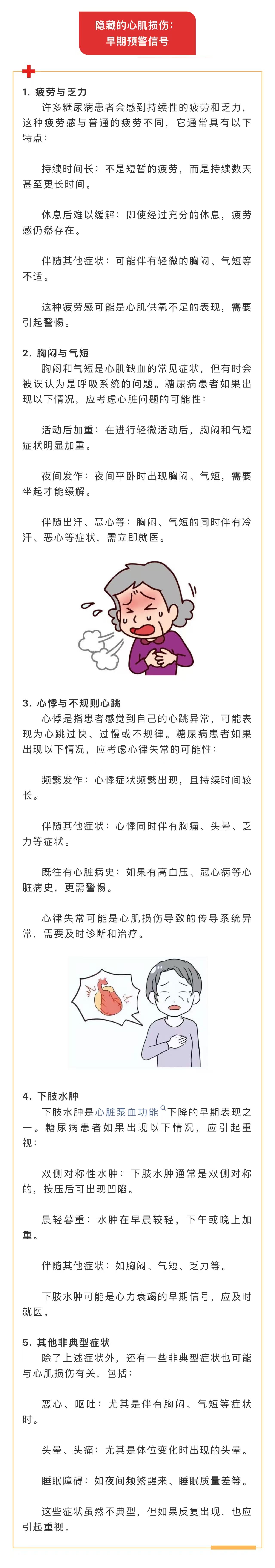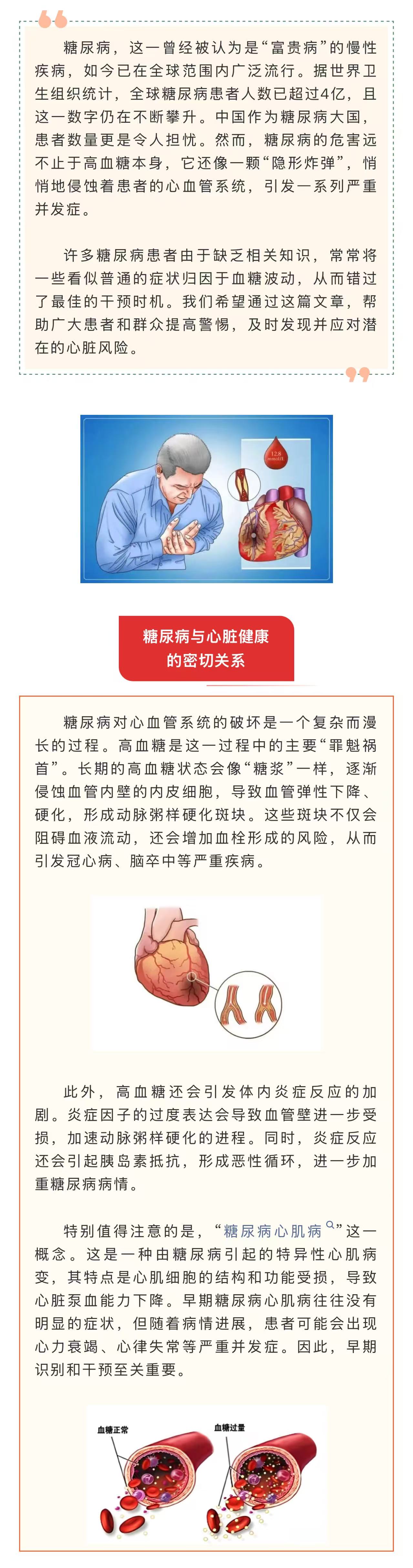 图文简介: 许多糖尿病患者由于缺乏相关知识,常常将一些看似普通的症状归因于血糖波动,从而错过了最佳的干预时机。我们希望通过这篇文章,帮助广大患者和群众提高警惕,及时发现并应对潜在的心脏风险。
