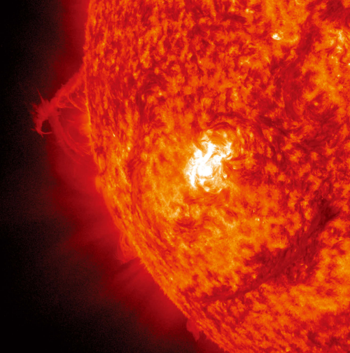 耀斑是指太阳大气中的高能辐射爆发现象,一道太阳耀斑所释出的能量相当于1000多兆吨黄色炸药的威力,约是太阳每秒释放能量的1%。