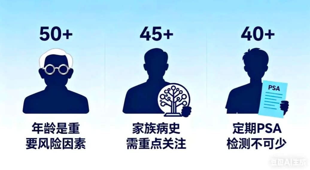 前列腺癌的发病主要与年龄、遗传、饮食、激素、环境等因素相关。以下高危人群需特别重视早期筛查: