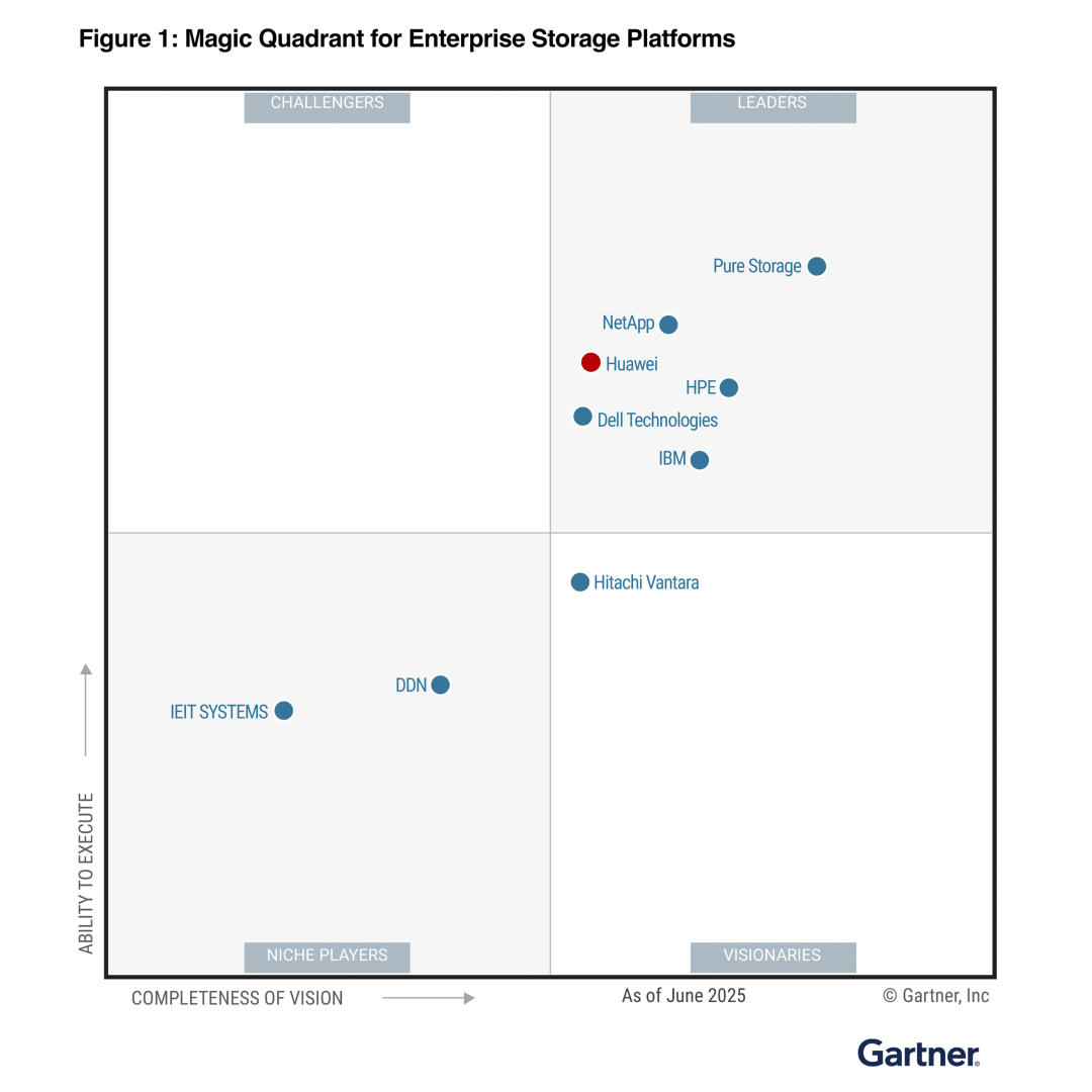 那么,在变与不变中,谁能在新时代摘得数据世界的存力之冠?就在刚刚,答案似乎已经产生。Gartner发布的《2025年企业存储平台魔力象限报告》显示,华为成功入选领导者象限,成为唯一跻身领导者象限的中国厂商,并在“执行能力”与“愿景完整性”两大维度均位列领先地位,甚至超越了耳熟能详的老牌厂商Dell。