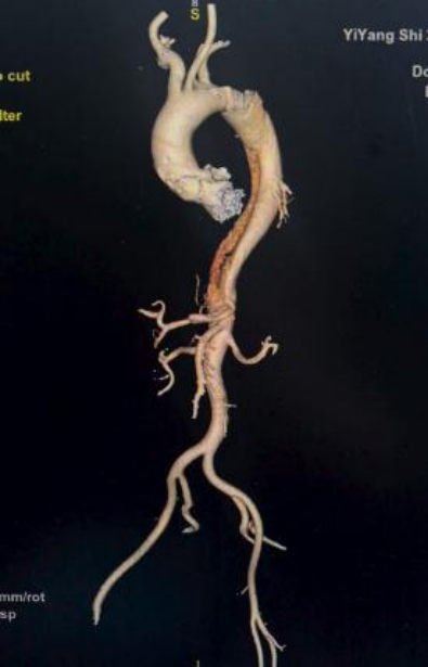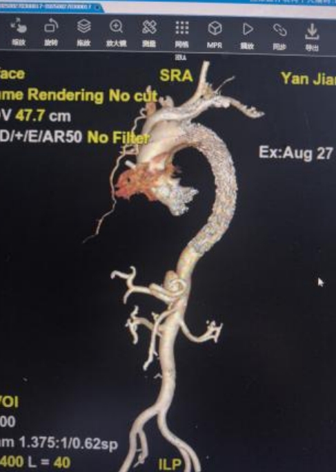 47岁的晏女士因突发胸背部“撕裂样”剧痛2小时被紧急送至该院。急诊科立即启动危重症救治流程,经主动脉CTA检查,确诊为Stanford B型主动脉夹层。