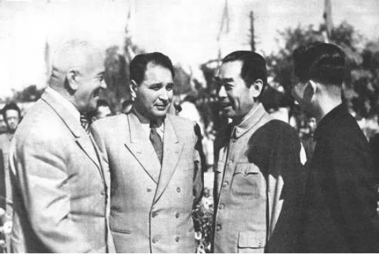 北外第一位罗马尼亚语教师裘祖逖(右一)为周总理翻译