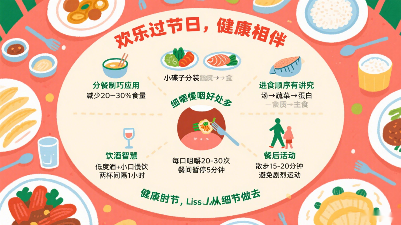 黄灯食物(限量通行):瘦肉(每日不超过一副扑克牌大小)、坚果(每日一小把)、月饼(每次1/4块,选择低脂款式)。李大妈分享:“月饼分享吃,快乐不减分;一人独享完,医院等着你”。