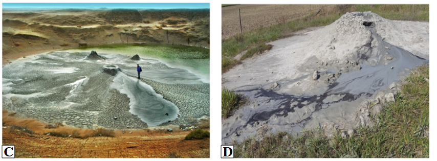 (右)意大利的小型锥形泥火山锥,直径2米,可见石油渗漏。