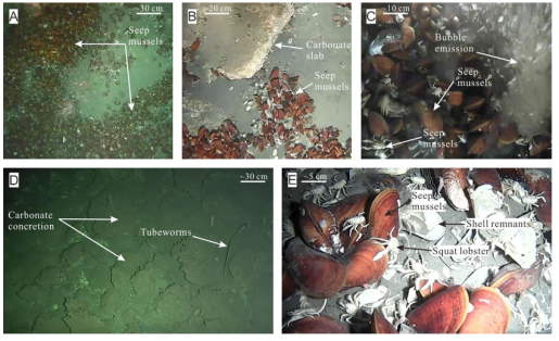 泥火山附近海底观测结果:贻贝(A)、碳酸盐板(B)、气泡释放(C)、碳酸盐结核、管虫(D)、铠甲虾及贝壳残骸(E)