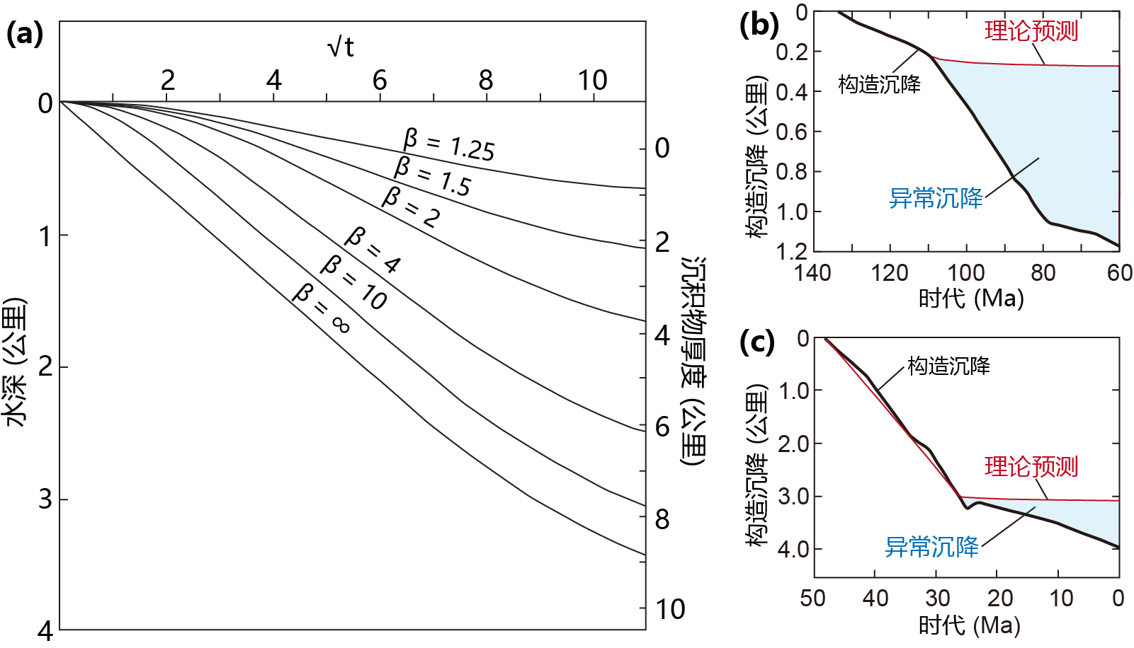 图1. 裂谷盆地沉降过程的理论模型与“非典型”案例。(a)不同伸展量(β)下的理论沉降过程(McKenzie, 1978, EPSL)。(b)松辽盆地白垩纪沉降过程的重建模型。(c)渤海湾盆地新生代沉降过程的重建模型。