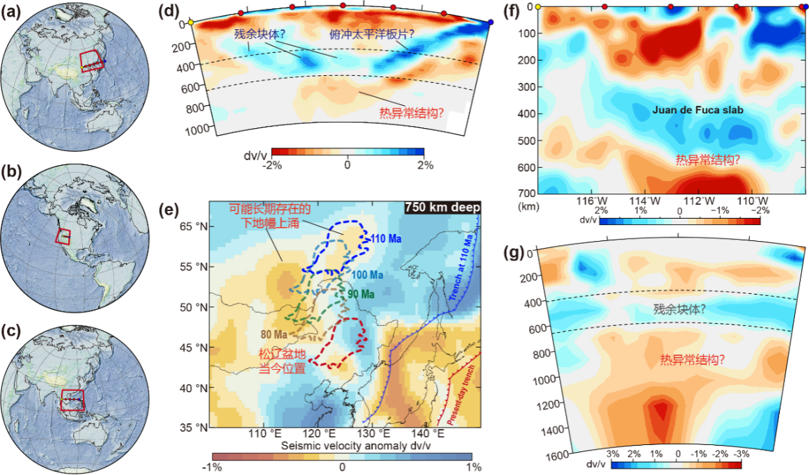 图2. 典型研究区的地幔波速结构。(a)图d的切面位置图。(b)图f的切面位置图。(c)图g的切面位置图。(d)东北亚地幔波速结构切面。(e)东北亚750公里深处的平均波速结构。(f)黄石-斯内克河平原下方的地幔波速结构切面。(g)中国南海下方的地幔波速结构切面。