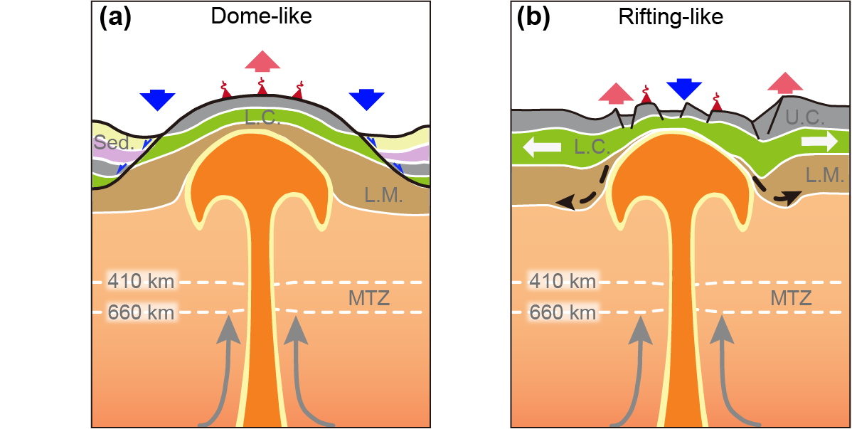 图3. 前人研究揭示地幔柱的地形响应以抬升为主。取决于岩石圈的先存应力状态,地幔柱可以导致地表出现长波长(a)或短波长(b)的抬升。