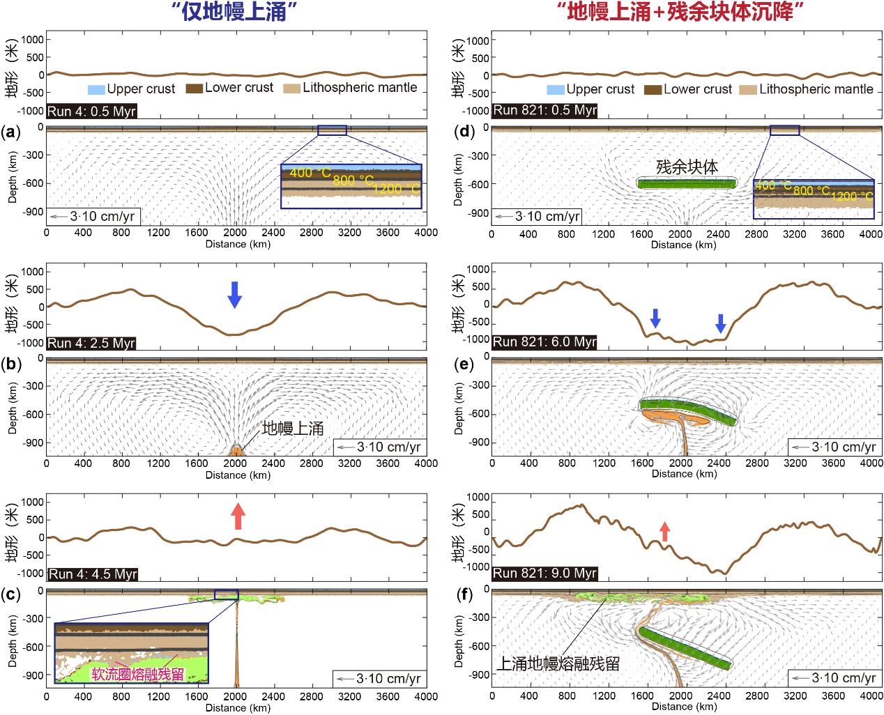 图4. 代表性数值模型结果。(a)-(c)仅地幔上涌的模型。(e)-(f)地幔上涌与沉降残余块体共存的模型。团队测试过的其他动力学演化过程见文章正文。