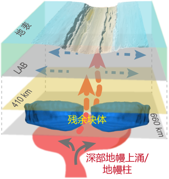 经团队研究发现,在出现过异常沉降区域正下方的深部地幔,都(曾)存在有疑似的下地幔上涌(地幔柱)与地震波高速体共存的现象(此类高波速结构可能代表了俯冲板块或拆沉岩石圈块体,在此统称为“残余块体”)(图2)。