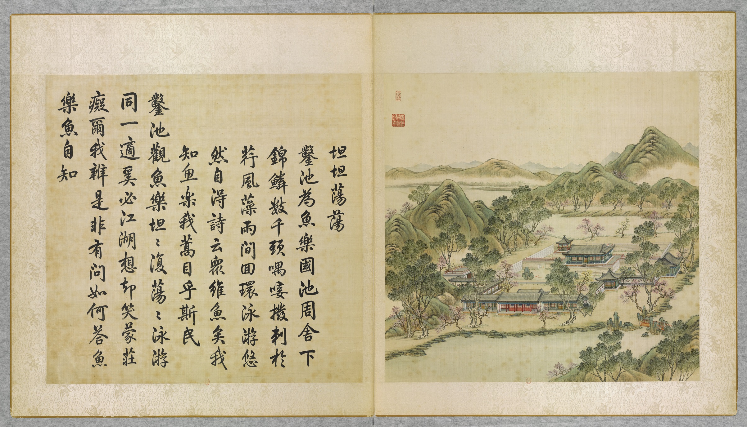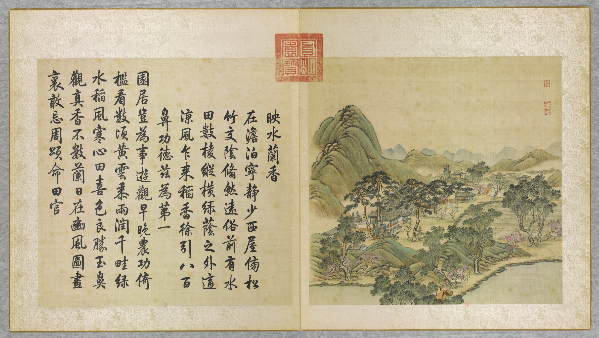 唐岱、沈源绘制的《圆明园四十景》,内池宽 62.3 厘米,高63厘米,外裱20厘米云鹤纹白绫,共四十幅。汪由敦书乾隆所作四十景诗,亦四十幅,装裱规格与图相同。景图和诗共八十幅,分装两巨册。第一册画前,有雍正《圆明园记》和乾隆《圆明园后记》,以下均左诗右图,对幅折叠。图文并茂,相得益彰。