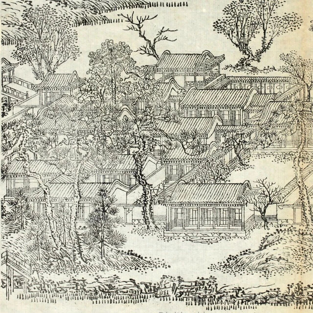 乾隆朝清晖阁乃新建而非继承,不仅殿名是新拟的,其建筑本体亦非雍正所遗留,不变的只是地点。彩绘本四十景《九州清晏图》中,清晖阁所在位置只有一排不起眼的平台房,其后方为一面高大的粉白院墙,非殿非阁,隐现于松枝之间,看上去有些不伦不类(图1)。到乾隆十年成书的木刻本四十景图时,清晖阁才悄然现身,同样隐于松后,却只有一层。它看上去比东侧的乐安和高大一些,一则因位置靠后,二则是进深较大,故而屋顶隆起较高。即便如此,也并未遮挡住左后方的小西配殿屋顶,显然只有一层(图2)。乾隆十三年周鲲所绘《应钟协律图》中的清晖阁也是一层,区别是前添敞卷,阁前九松历历可数(图3)。两图由不同作者从不同角度绘制,可知此时清晖阁确乎只有一层。单层建筑又非地板架空而称为阁,似乎反常但也并非不可能。一个切近的例子又可举雍正朗吟阁,故宫博物院藏《胤禛朗吟阁图像》中的建筑即为单层歇山顶,檐下赫然悬挂匾额“朗吟阁”,可见时人并不以此为意(图4)。