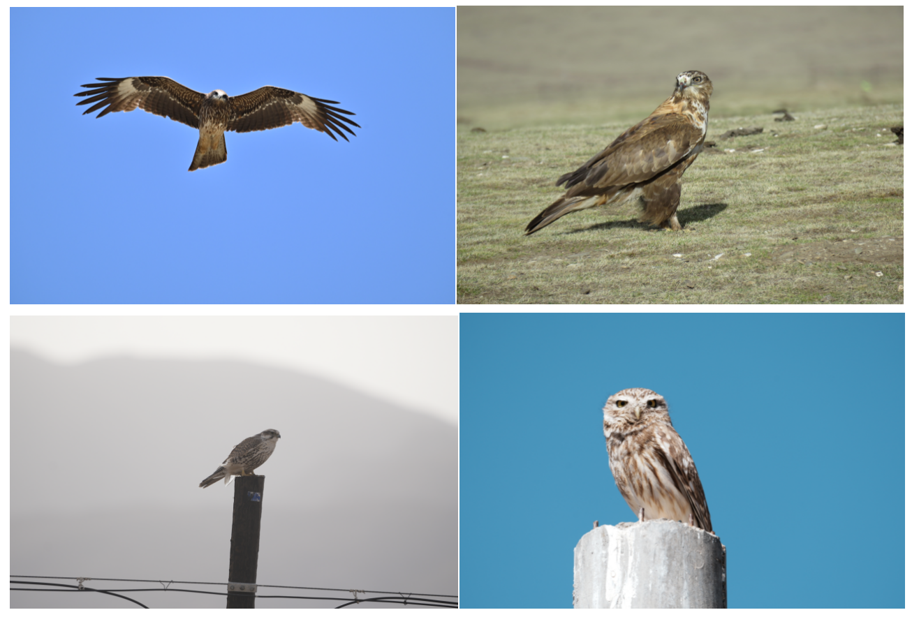 黑鸢(左上)、大鵟(右上)、猎隼(左下)和纵纹腹小鸮