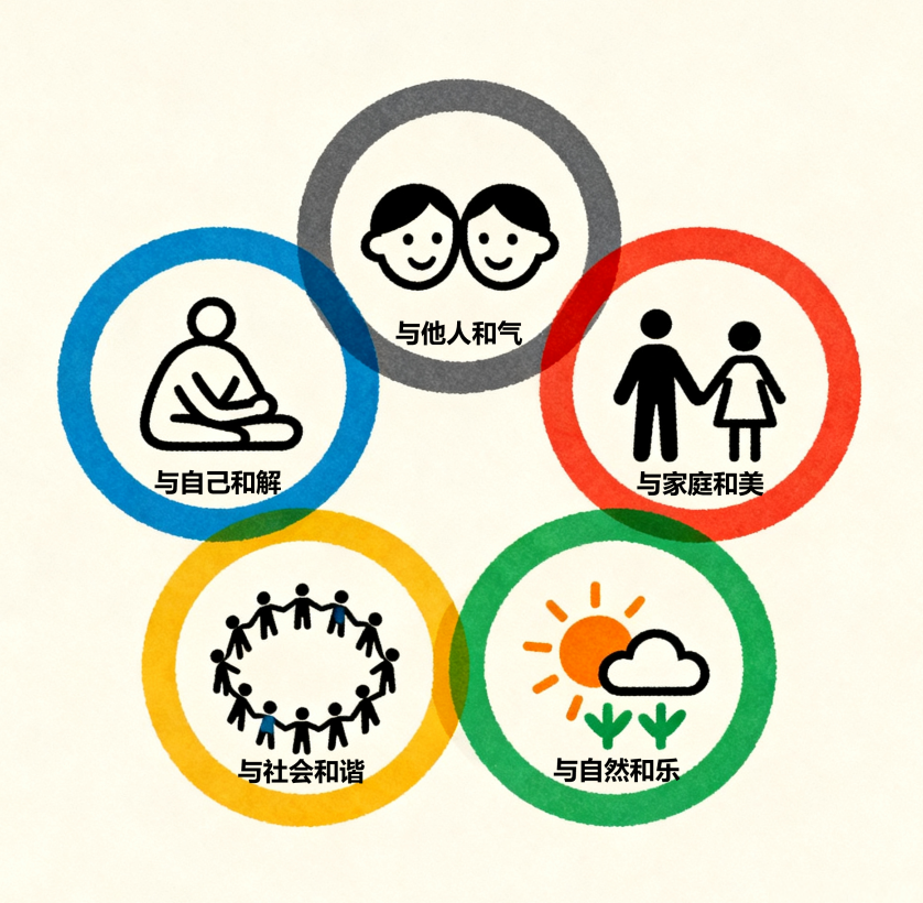 当下“人生没有意义”的说辞并非全无来由,它往往是现代人在快节奏及高压力下,个体与自我、他人、社会及自然联结弱化甚至断裂后的一种不快乐的“情感休克”。实则与自己和解、与他人和气与家庭和美与社会和谐与自然和乐之“五和”,可谓是照亮迷雾、让人们重归人生意义之岸的五座灯塔。这“五和”并非割裂的个体,而是一个环环相扣、生生不息的有机整体,共同构成了人生意义的坚实基座与快乐之源。