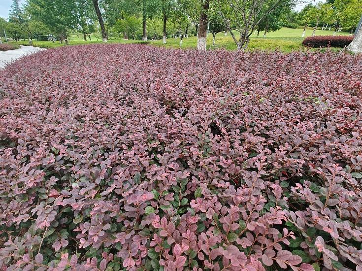 红花檵木四季叶色常红,花朵艳丽,四季有景,观赏价值极高,在园林中既可以作为独立景观植物,也可以成片栽种,同时还可以与其他树种搭配栽种,形成色彩层次丰富的植被景观。而红花檵木的固土护坡以及抗逆性强、低养护成本的特点也让其在生态修复中发挥重要作用。