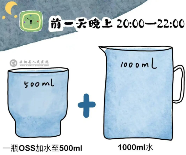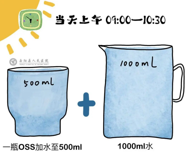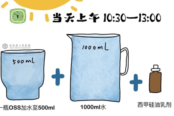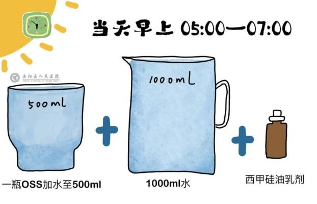 ②检查当天早上05:00开始再服一瓶。(别忘了在最后一杯水中加入西甲硅油乳剂,它能减少胃肠内的气泡)