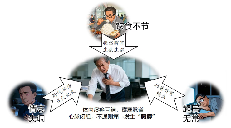 王先生长期饮食不节(损伤脾胃,生痰生湿)、情志失调(肝气郁结,日久化火)、起居无常(耗伤肝肾精血),导致体内痰瘀互结,壅塞脉道。心脉闭阻,不通则痛,故而发生“胸痹”(即心肌梗死)。