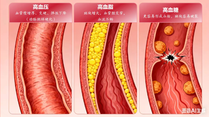 危害:血糖就像糖浆,让血液变得粘稠,损害血管内皮细胞,并促进炎症反应。这种“糖毒性”会持续腐蚀血管壁,使斑块变得更“脆”、更不稳定。