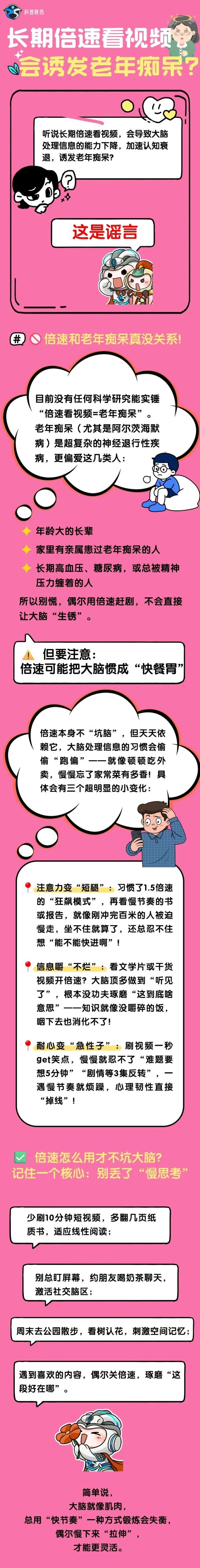 图文简介: 当1.5倍速、2倍速成为视频播放的默认选项,当“快进”成了信息接收的本能动作,“倍速看视频会诱发老年痴呆” 的传言,难免戳中人们对认知衰退的焦虑。