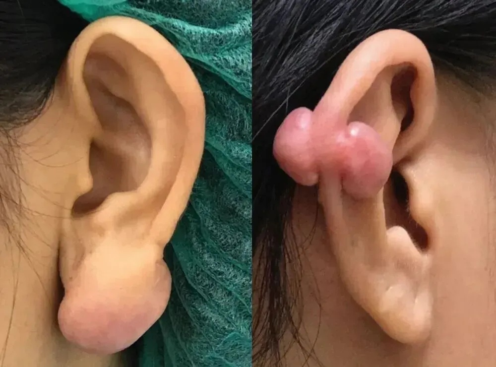 图 1. 打耳洞后的瘢痕疙瘩;图 2. 打耳洞后的瘢痕疙瘩(来自参考资料)