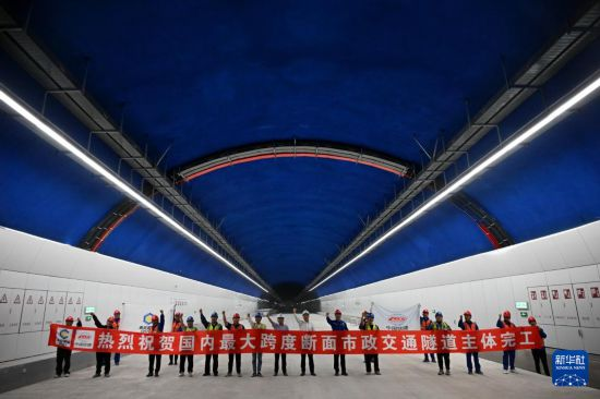 据介绍,该隧道全长1551米,双向双洞8车道,最大开挖跨度31.8米,最大开挖断面447.62平方米,是我国目前最大跨度断面市政交通隧道。