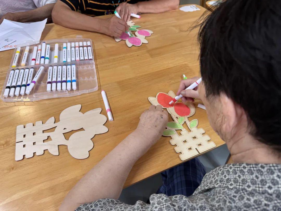 大厅里,老人们在医生和护工的协助下,正专注地为木质摆件涂色