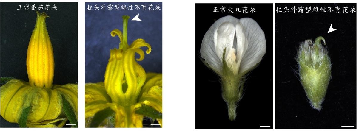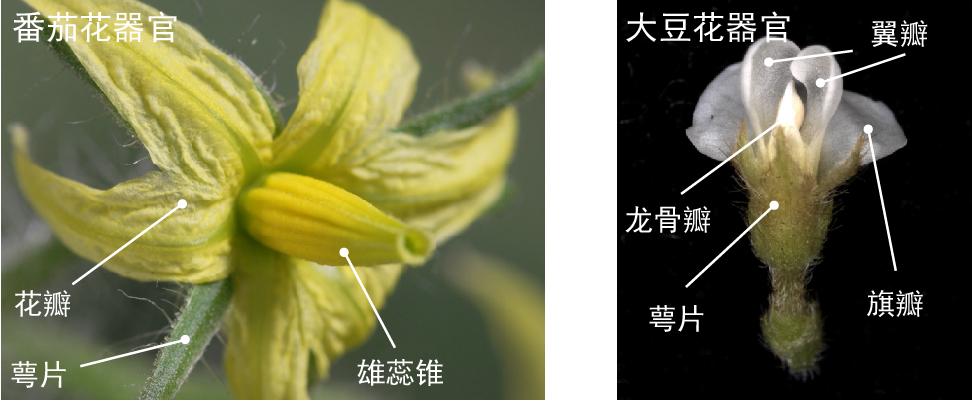 随着社会发展,人们对育种效率的要求越来越高,作物花型已经成为限制杂种优势利用、提高育种效率的一大瓶颈。以番茄为例,它的雄蕊像一个“锥形”的小灯笼,雄蕊锥把雌蕊紧紧包裹,几乎不给外来花粉“插足”的机会。大豆更是“铁桶阵”,龙骨瓣紧紧包裹,柱头完全藏在其中,人工授粉不仅耗时,还常常失败(图1)。