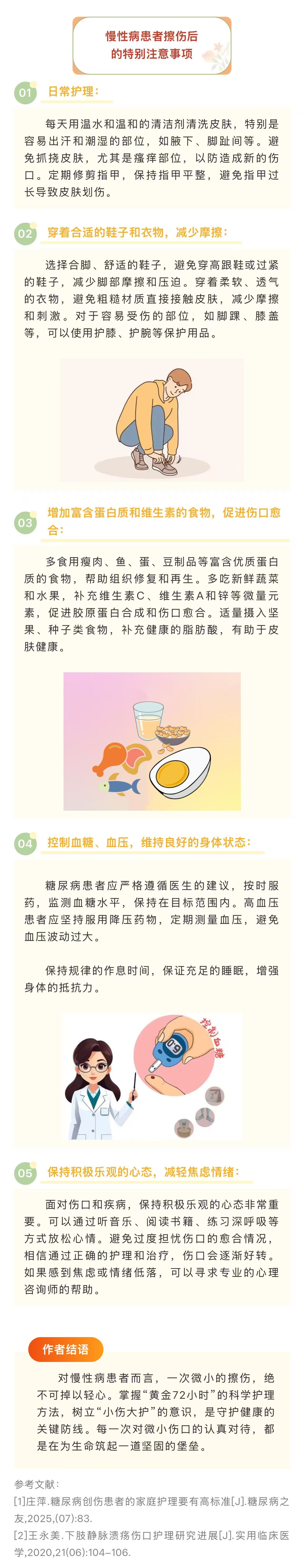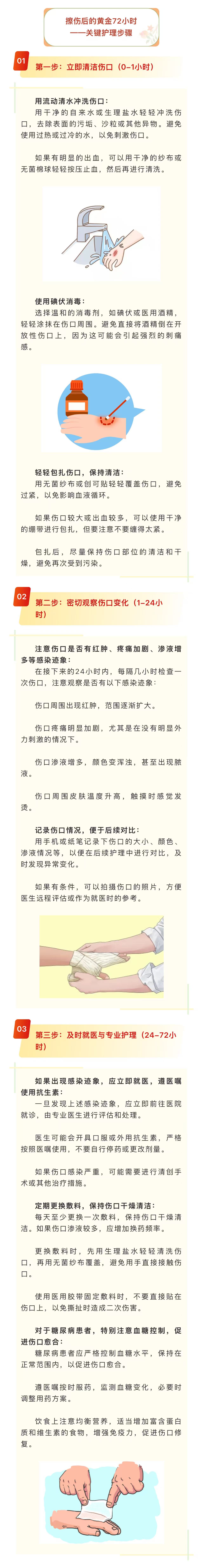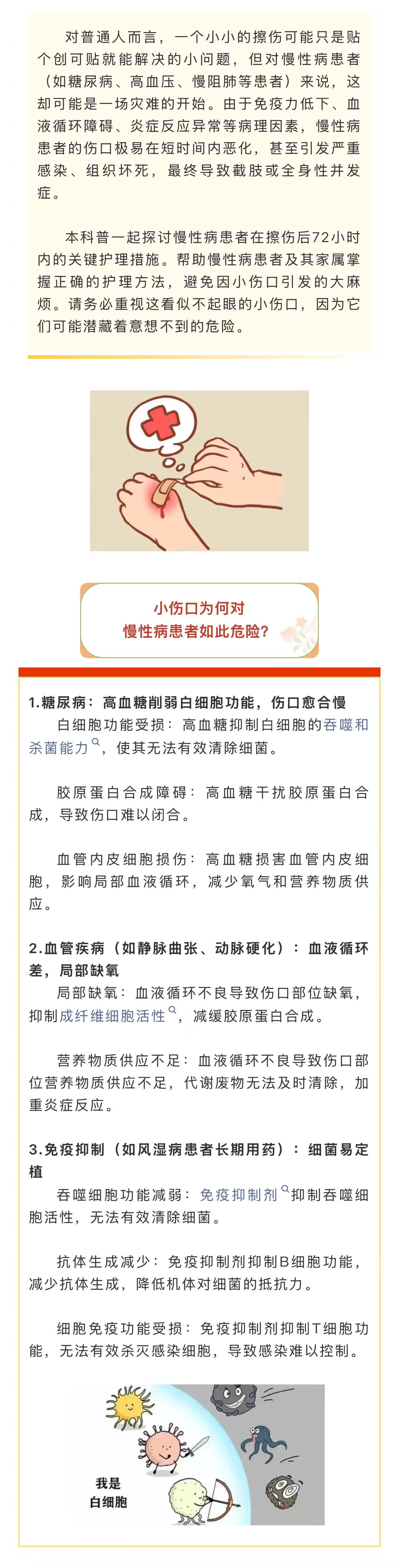 图文简介: 本科普一起探讨慢性病患者在擦伤后72小时内的关键护理措施。帮助慢性病患者及其家属掌握正确的护理方法,避免因小伤口引发的大麻烦。请务必重视这看似不起眼的小伤口,因为它们可能潜藏着意想不到的危险。