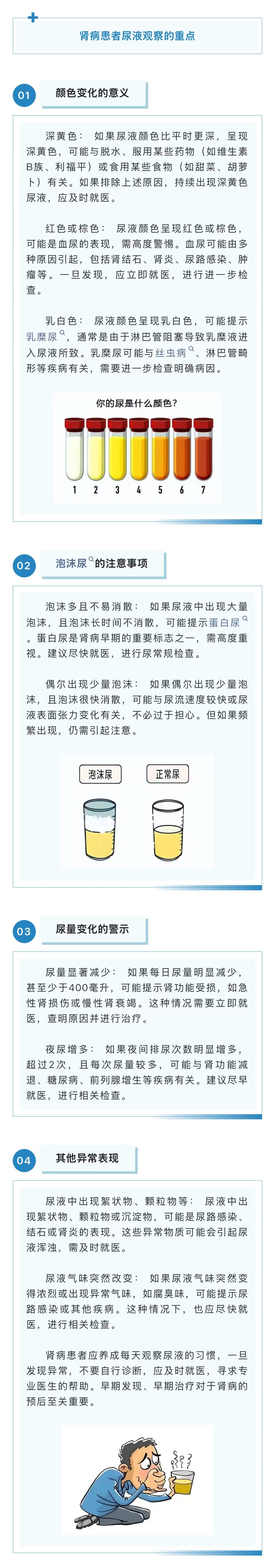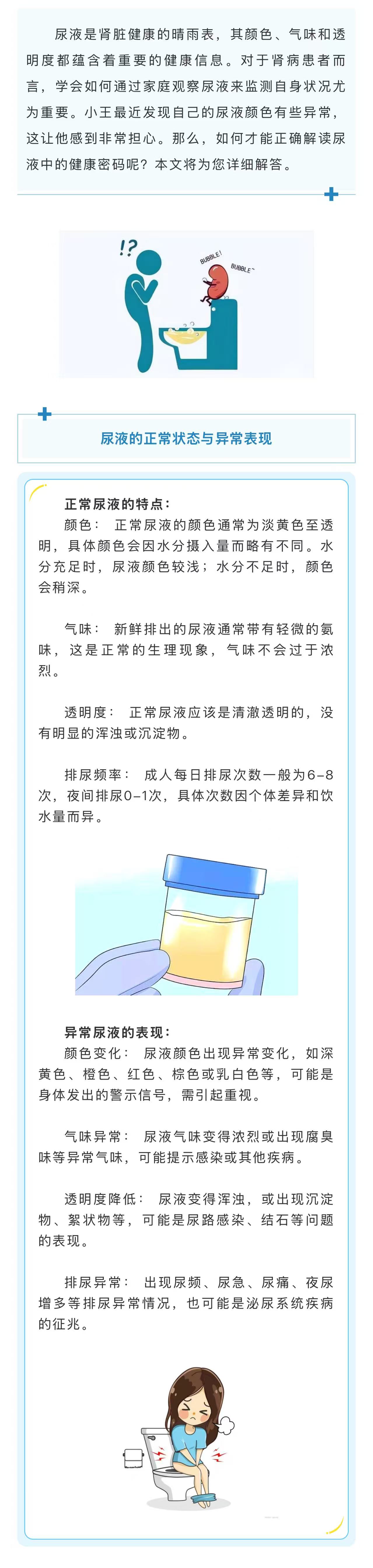 图文简介: 尿液是肾脏健康的晴雨表,其颜色、气味和透明度都蕴含着重要的健康信息。对于肾病患者而言,学会如何通过家庭观察尿液来监测自身状况尤为重要。