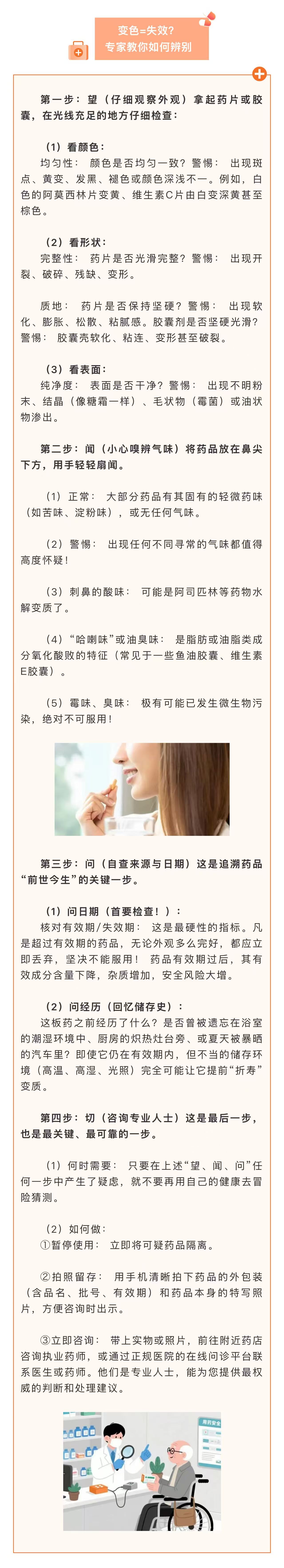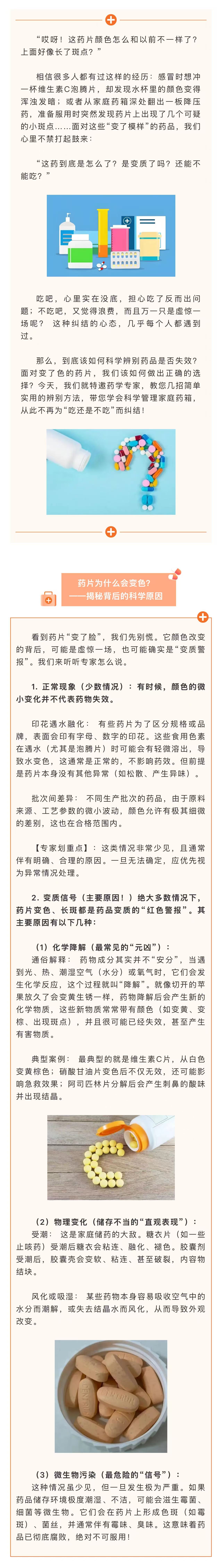图文简介: 到底该如何科学辨别药品是否失效?面对变了色的药片,我们该如何做出正确的选择?今天,我们就特邀药学专家,教您几招简单实用的辨别方法,带您学会科学管理家庭药箱,从此不再为“吃还是不吃”而纠结!