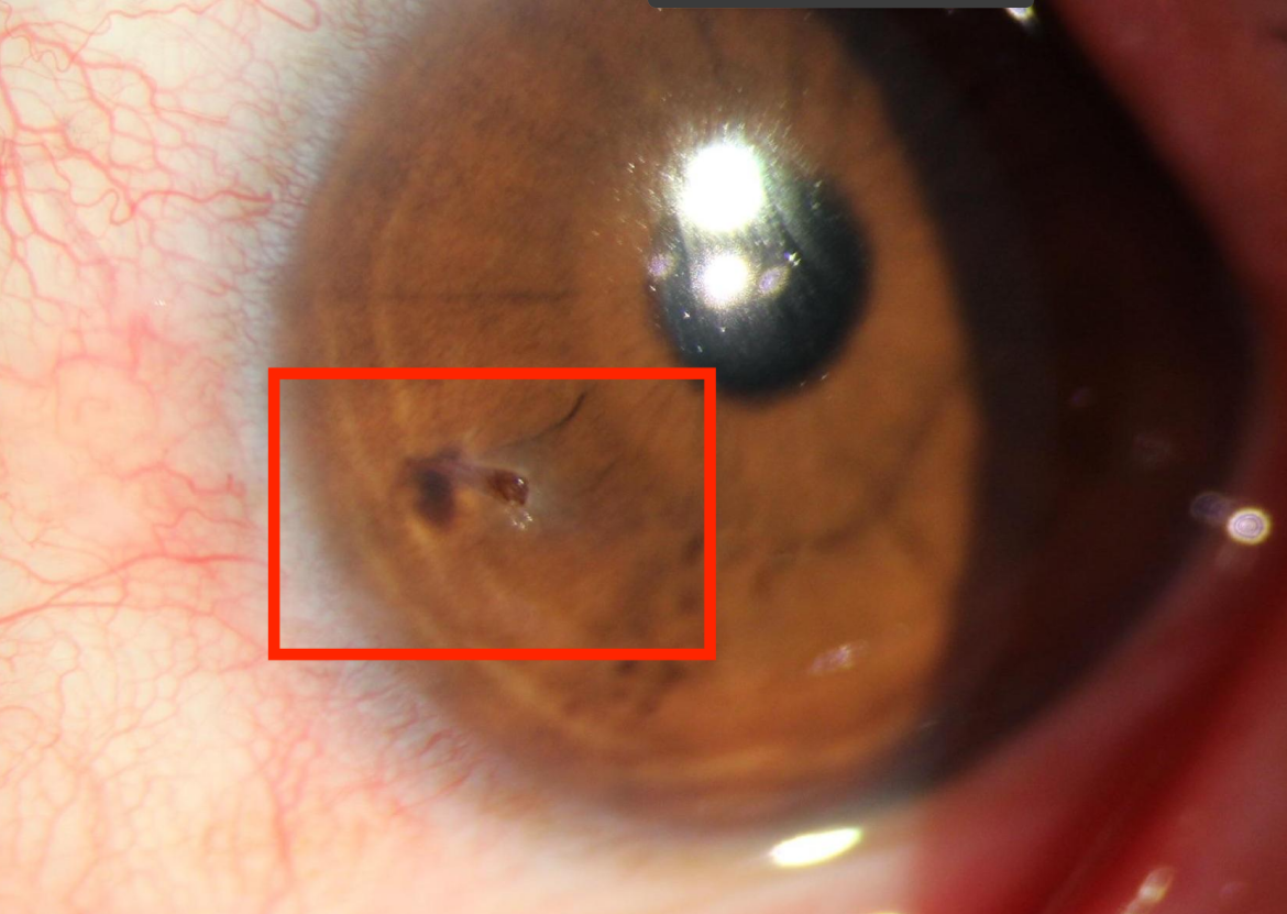 经检查,罗阿姨的左眼视力已降至0.4,眼睑周围红肿淤青,结膜严重充血水肿。更危险的是,一根细长的板栗刺像一枚“毒针”,深深扎入角膜,末端已刺入前房,随时可能引发严重感染乃至眼内炎,导致失明。
