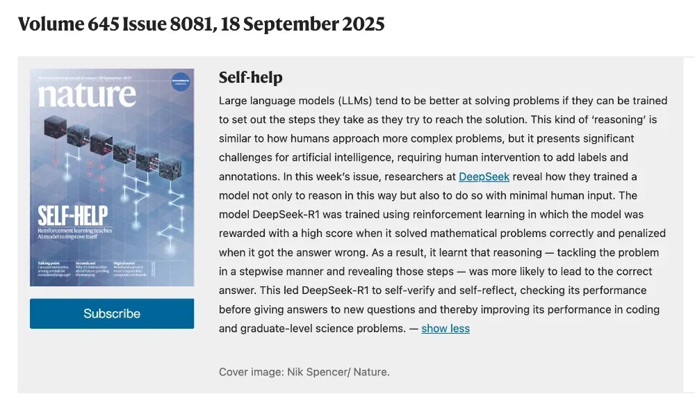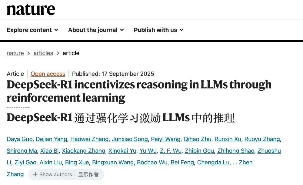 刚刚,人工智能的科研领域又传来一则提振人心又实至名归的消息:讲述Deepseek R1整个复杂训练流程的论文登上了最新一期《自然》(Nature)的封面,通讯作者正是 Deepseek 的领军人物梁文锋。