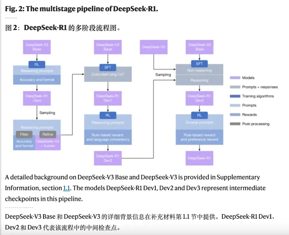 论文直观地展示了整个复杂的训练流程,构建了从DeepSeek-R1-Zero(纯RL探索)到DeepSeek-R1(多阶段优化)的清晰演进路径。
